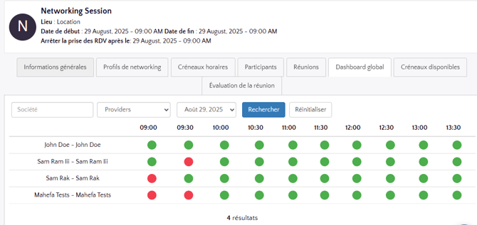 Avec le tableau de bord Global, vous avez la possibilité de gérer facilement le Networking des participants. C'est très utile, surtout pour les événements où les organisateurs gèrent aussi l'agenda de certains participants, comme les VIP par exemple.