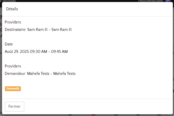 - Si vous cliquez sur les points rouges, vous verrez les réunions en attente de confirmation ou déjà confirmées pour le créneau sélectionné.