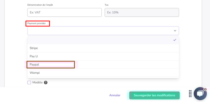 - Descendez jusqu'au champ "Payment provider" et choisissez PayPal.