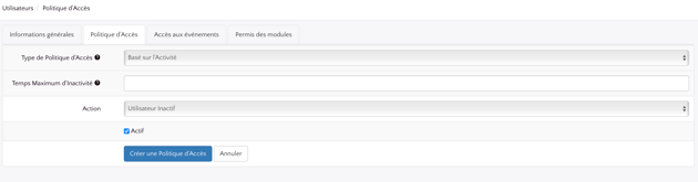 Une fois l'utilisateur créé, un nouvel onglet intitulé "Politique d'accès" est automatiquement ajouté, où vous pouvez créer les deux politiques d'accès disponibles.