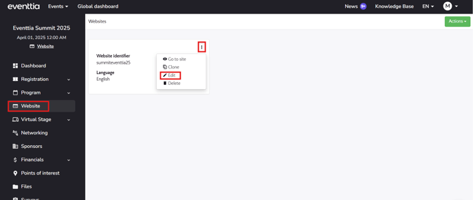 - Go to the 'Website' module, then click 'Edit' on the website where you want to add the video.