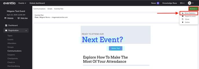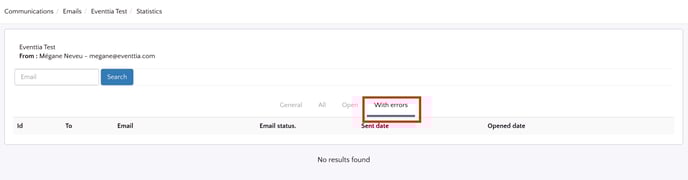 Once your mass email has been sent through Eventtia, you can access the statistics to analyze its performance. This includes key metrics such as open rate, errors, and delivery status.
