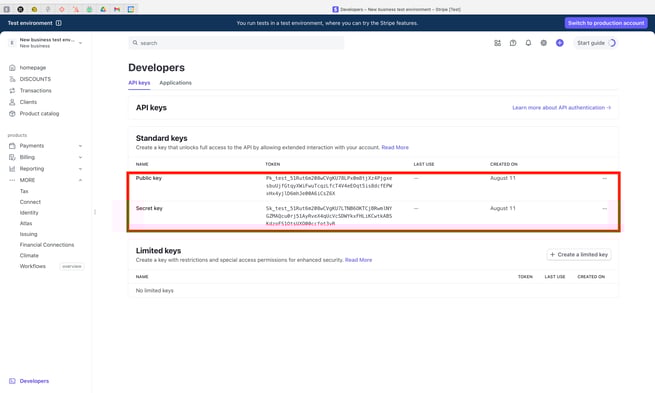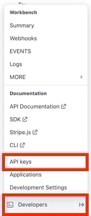 Select the "Developers" menu at the bottom of your Stripe account, then click on the "API keys" submenu.