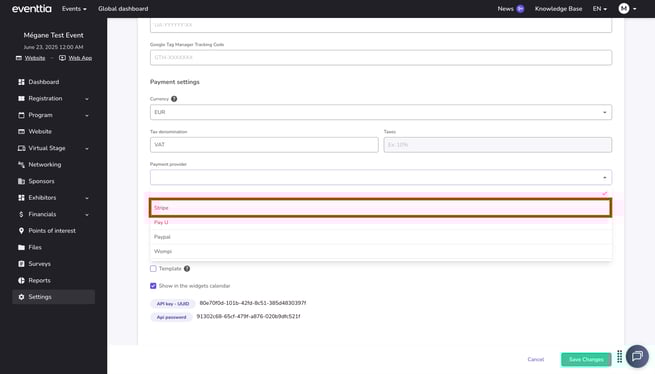 - Paste the API keys you copied earlier from your Stripe account into the corresponding fields in Eventtia’s settings: