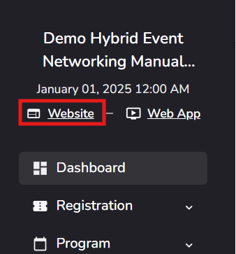 - Click on the 'Website' button in your back office. This will open a new tab with the website you have created in Eventtia