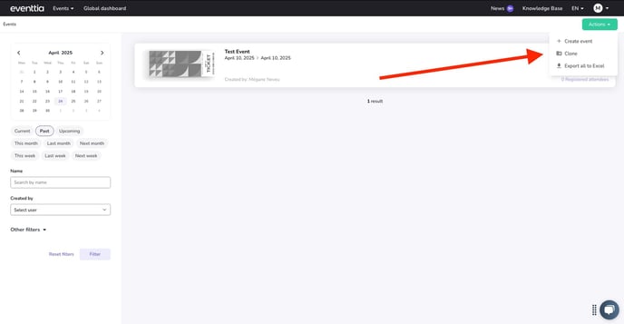 - From your event dashboard, click on the green "Actions" button and then on "Clone"