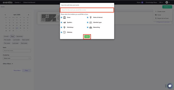 - Find the event that you wish to clone using the search bar, then select the modules you want to copy into your new event and finally, click on "Clone":