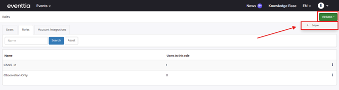 Click on the “Roles” tab and, from the “Actions” button, select “New” to create a new role type.