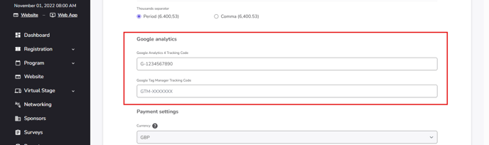 - Enter this code in the box in your Eventtia Backoffice, and click "Save" at the bottom of the page.