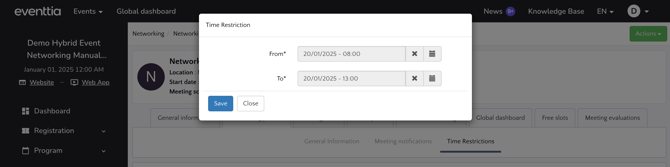 - Global Time Restriction: A restriction imposed by the event organizer on all participants of a certain networking profile type, for example if there is a compulsory conference or workshop at a certain time.