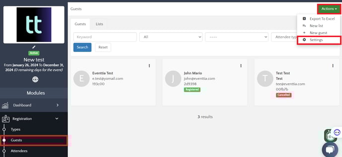 Once the email is sent and the first registrations are recorded, this will be traceable from the "Guests" tab.