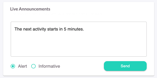 - Live Announcements: This is where you can send live messages to all your participants on the Virtual Stage at the moment. People will be able to see your message on their respective screens inside the Virtual Stage.