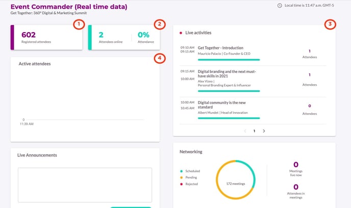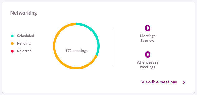 - Networking: Here you will have an overview of what is happening in networking session, how many meetings are live in "Meetings live now" and likewise, how many participants are in meetings in "Attendees in meetings".