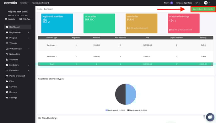 On your event's Dashboard module you will find the button "Launch Event Commander" here you would be able to see real time date on the date of your event
