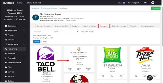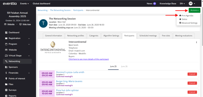 Participants and the organizers can both check the Newtorking agenda. Find below how to check and manage the participants' agenda.