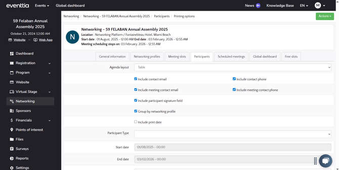 • The event organizer can also print off a list of the full agendas of every participant. To do so, click on the green Actions button in the top-right corner, then on Print Agendas.