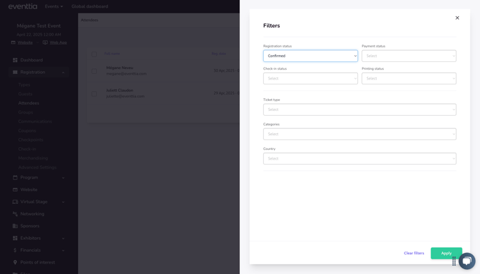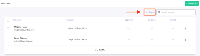 - If you only want to print badges for a certain type of attendees, click on the filter button and select the attendee type, select the criteria you want (e.g. registration status, payment status, ticket type, etc.), then click “Apply”. Once the filter is applied, once again, click on the green “Action” button in the top right corner and select “Print Badges” to print badges only for the filtered attendees.