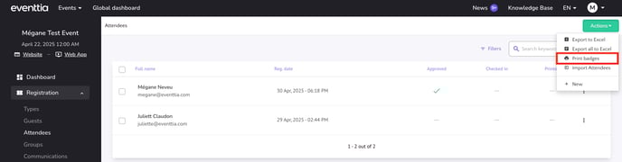 - You can also print all the badges for your event by clicking on the green "Action" button in the top right corner, then "Print Badges".
