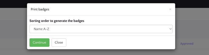 After clicking “Print Badges”, a pop-up will appear titled “Sorting Order to Generate the Badges”. You can choose how the badges should be sorted (e.g. by first name, last name, company, etc.). Once you’ve made your selection, click “Continue” to generate the badges.