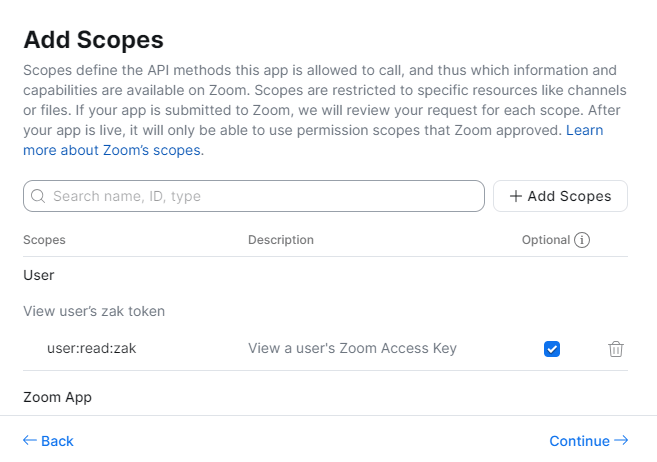 5. In the Add Scopes section, leave the default configuration, click continue.