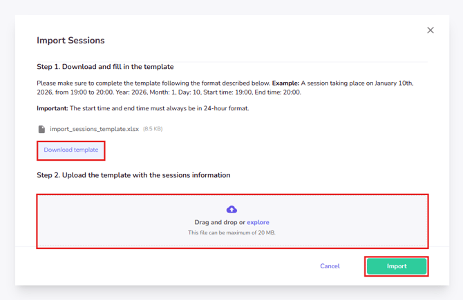 The system will process your file and automatically create all the sessions listed in your template.