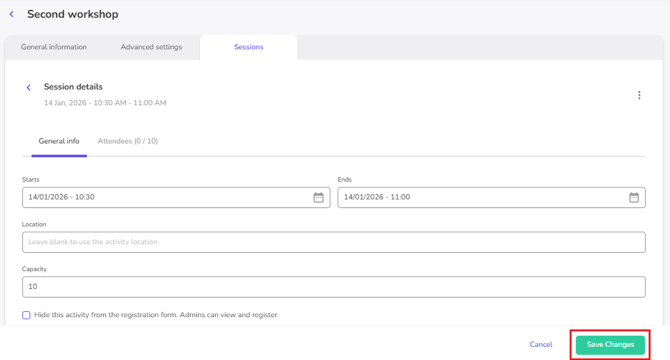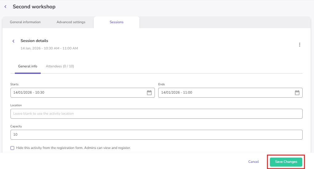 - Once your activity is created and saved, and after you have configured its General Information and Advanced Settings, you can start adding slots under the Session tab.
