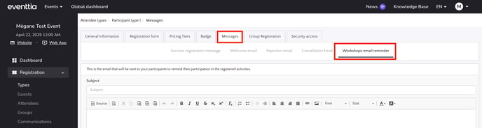 - Click on the corresponding attendee type, and in the Messages tab, compose the Activity Reminder under “Workshop email remainder” once the Reminder option has been enabled.
