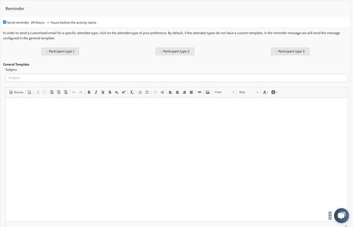 - If you want to create a template reminder for all attendee types, you can fill in the General template by adding a subject and the text of the reminder.