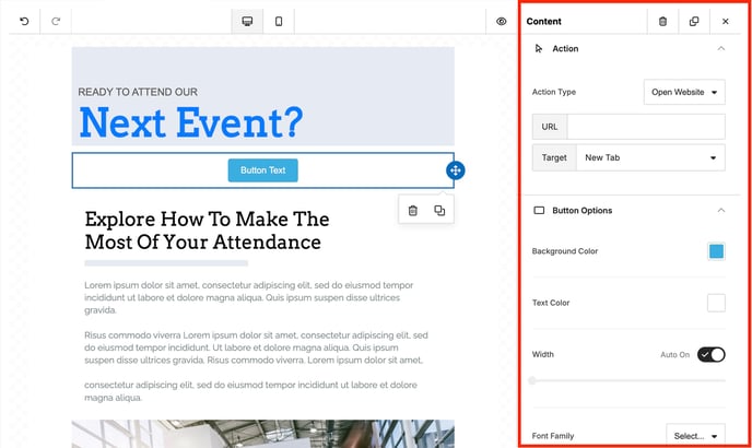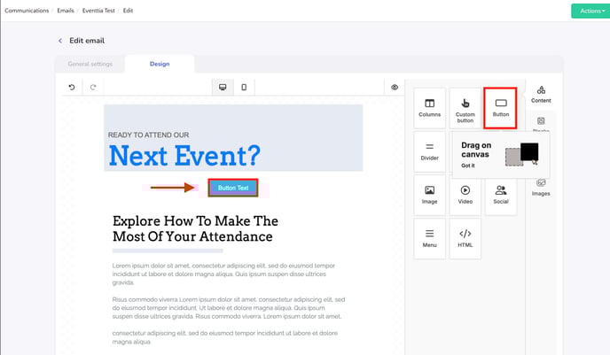 - Drag and drop the Buttons block into your email layout, wherever you want it to appear.