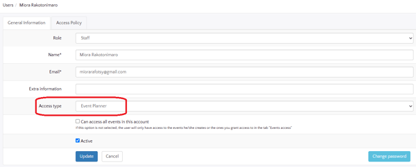 Once the role is created and assigned to the user, you will have the option to select the access type. Make sure to select Event planner as the access type. Hit the Update button to save the change.