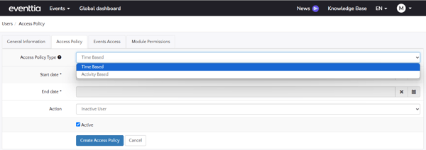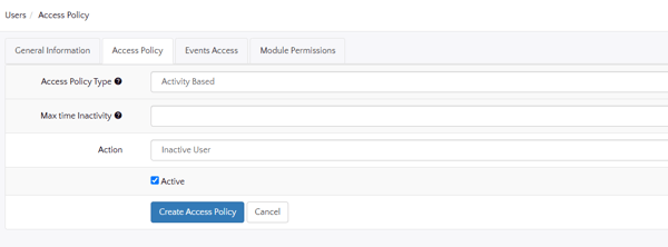 In the following page, make sure to select Time based as Access Policy type. Then, set the start date and end date between which the access policy applies. In the Action field, select either Inactive user or Delete user. Once everything is ok, check the box for Active, if not yet, then click on Create Access Policy to save the policy.